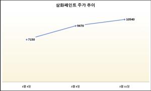 매일일보 = 서효문 기자 | 삼화페인트 주가가 삼성SDI발 호재로 일주일 새 47% 이상 급등했다.11일 한국거래소에 따르면 지난 4일부터 이날까지 삼화페인트 주가는 47.41% 상승했다. 지난 4일 7150원이었던 해당 종목 주가는 6거래일간 3390원이 올라 11일에는 1만540원으로 장 마감했다.해당 종목 주가가 상승세를 달린 이유로는 지난주에 체결한 삼성SDI 반도체 패키징 소재 공급 소식이 꼽힌다. 삼화페인트는 지난 6일 삼성SDI와 함께 반도체 패키징용 에폭시 밀봉재(EMC) 조성물에 쓰이는 고성능 MMB(Melt Mas