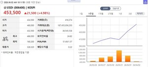 삼성SDI(006400)가 업황 저점을 통과해 본격적인 실적 반등 구간에 진입했다는 증권가 분석이 잇따르면서 이틀째 가파른 상승세를 기록하고 있다.1분기 어닝 서프라이즈 전망… "컨센서스 상회"2일 오전 10시 11분 현재 한국거래소에서 삼성SDI는 전 거래일 대비 4.98% 오른 453,500원에 거래 중이다. 장 시작과 동시에 매수세가 유입되며 장중 한때 46만 원선을 터치하기도 했다. 전날 5.88% 급등한 데 이어 이틀 연속 강세를 보이며 시가총액은 36조 5,455억 원 규모로 불어났다.이날 IBK투자증권은 삼성SDI의 1